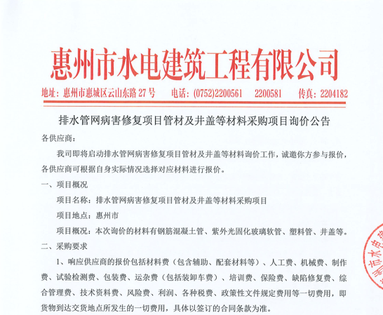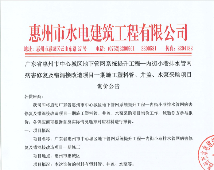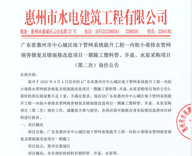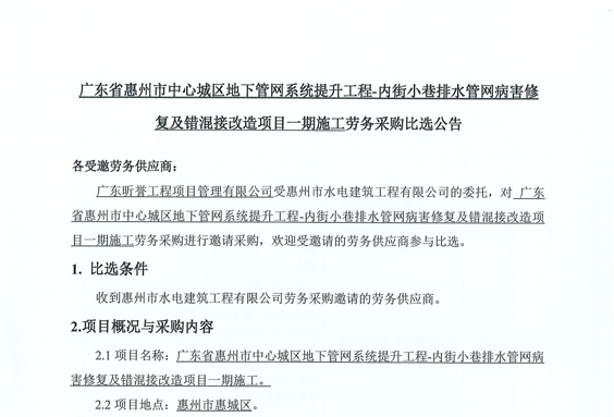 廣東省惠州市中心城區(qū)地下管網(wǎng)系統(tǒng)提升工程-內(nèi)街小巷排水管網(wǎng)病害修復及錯混接改造項目一期施工勞務采購比選公告……