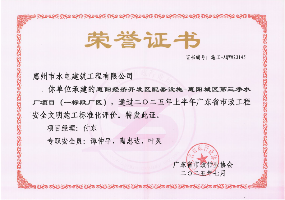 近日,廣東省市政行業(yè)協(xié)會傳來喜訊,由我司承建的惠陽經(jīng)濟開發(fā)區(qū)配套設施—惠陽城區(qū)第三凈水廠項目(一標段廠區(qū)),順利通過2025年上半年“廣東省市政工程安全文明施工標準化”評價。……